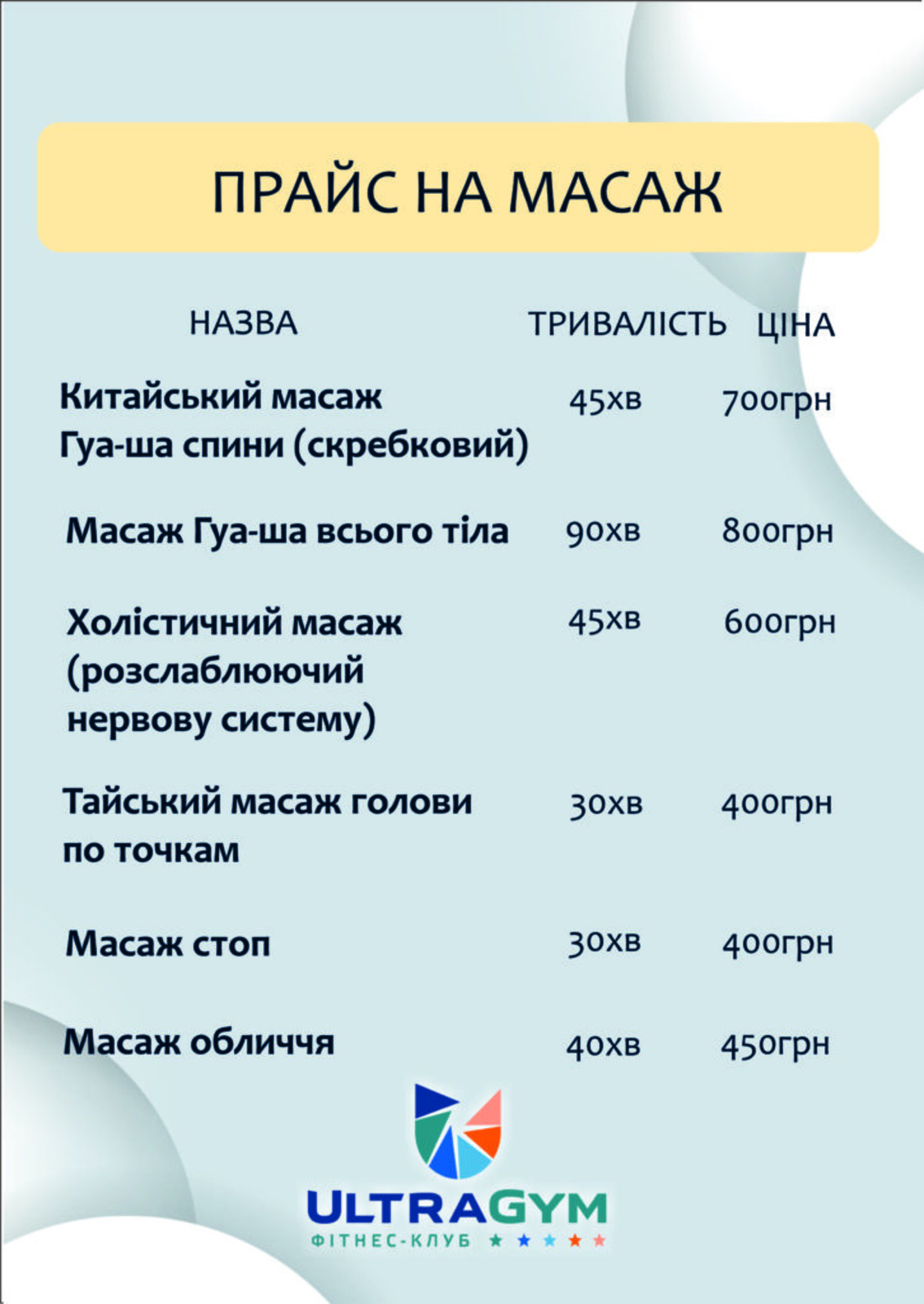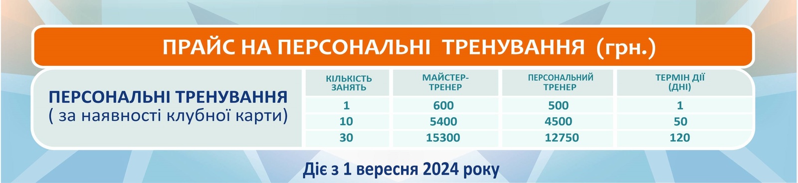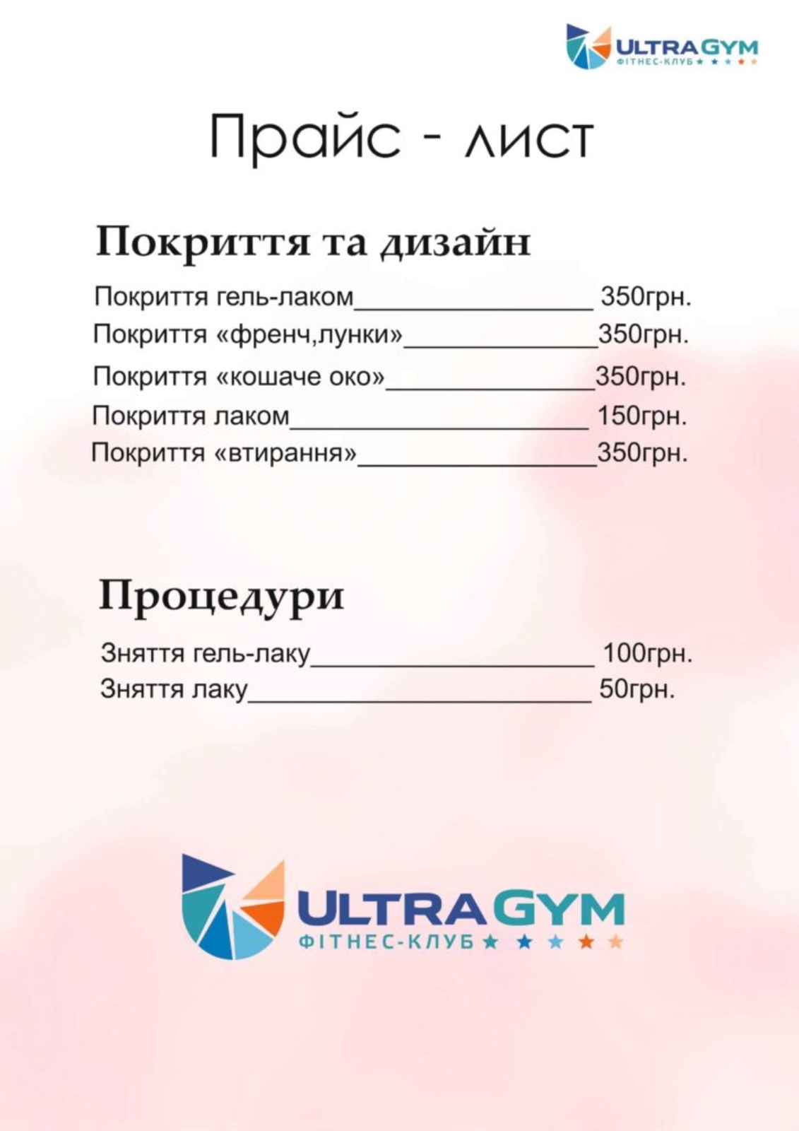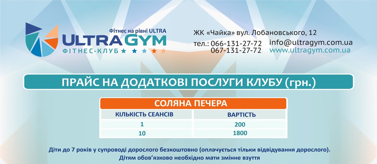Прайс КартиПерсональні тренуванняДитячі тренуванняСоляна печераСолярійМанікюрМасажСпортивне харчуванняКарти Персональні тренування Дитячі тренування Соляна печера Солярій Манікюр МасажСпортивне харчування