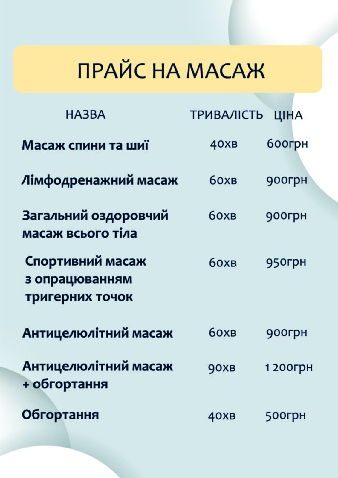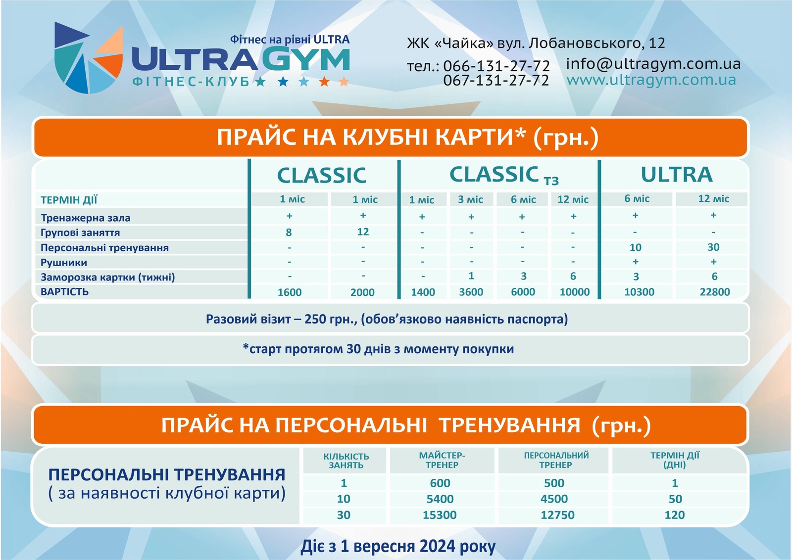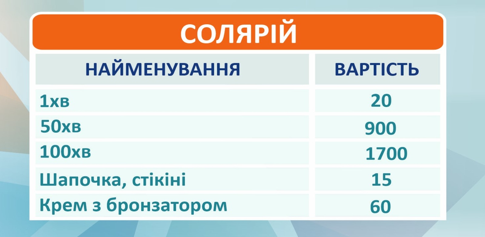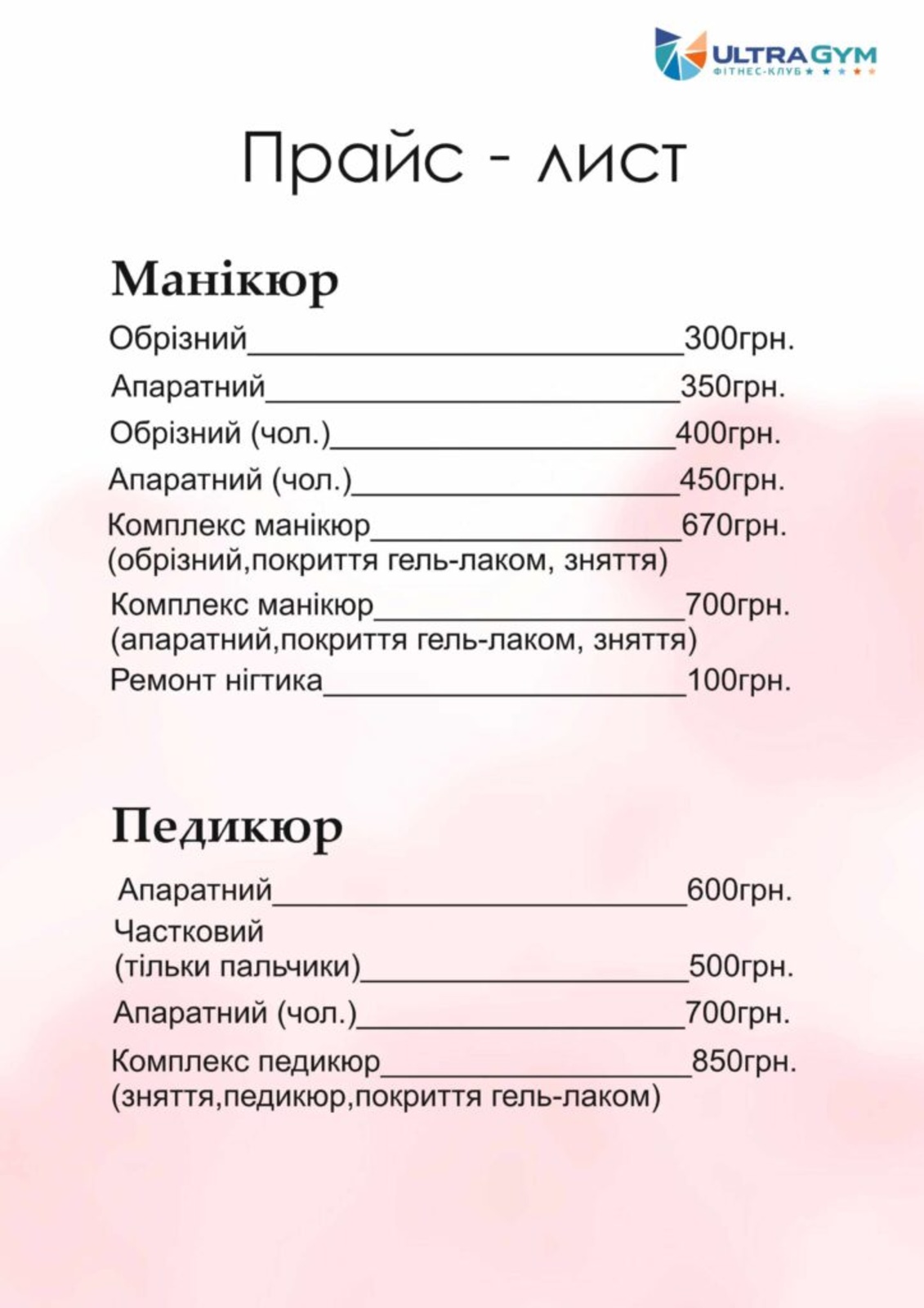 Прайс КартиПерсональні тренуванняДитячі тренуванняСоляна печераСолярійМанікюрМасажСпортивне харчуванняКарти Персональні тренування Дитячі тренування Соляна печера Солярій Манікюр МасажСпортивне харчування
